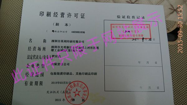 深圳市英利印刷有限公司成立于2004年,位于深圳市光明新区公明上村河堤路6号,厂房面积7500多平方米,员工200多名,是深圳印刷包装行业的知名企业。公司承接各种大型纸货架、纸展示架、纸陈列架、纸陈列箱、纸堆头、纸促销架、纸促销台、PDQ展示盒;以及各类电视机彩箱/家电包装箱/医疗包装箱/饮料包装箱等纸品印刷。      英利印刷拥有全新德国高宝5色1600*1210超全开印刷机+上光,德国高宝1300五色印刷机,日本全开三菱印刷机,罗兰700对开印刷机、全新戒样机,数码打印机,蓝纸机,CTP出版机,进口晒版机2台、切纸机2台、上光机2台、UV机1台、过胶机2台、自动裱纸机1台、半自动裱纸机2台,1.6米大自动啤机1台、1.8半自动啤机、手动啤机8台,自动粘盒机2台,打钉机6台等全新生产设备,工业区并配有见坑机和纸板机等瓦楞生产线。...... [ 查看详情 ]